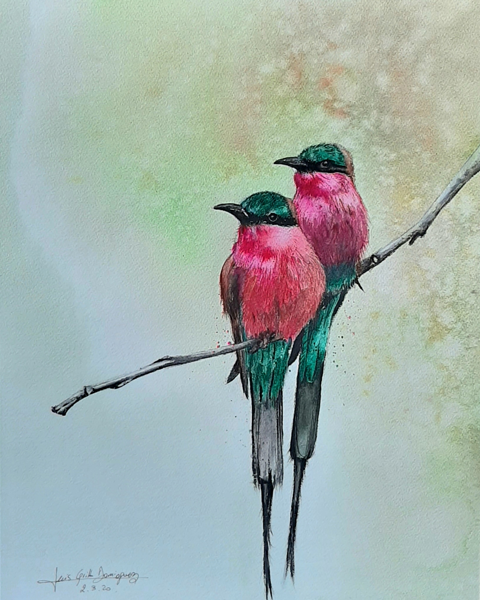 Descubre la belleza de la naturaleza con esta acuarela original hecha a mano. Esta obra de arte única captura a dos aves exóticas de colores vibrantes posadas en una rama, creando una imagen de compañerismo y tranquilidad. La técnica de acuarela da vida a la riqueza de los colores, con tonos de rosa, fucsia, verde y azul que se mezclan en el plumaje, creando un contraste fascinante.