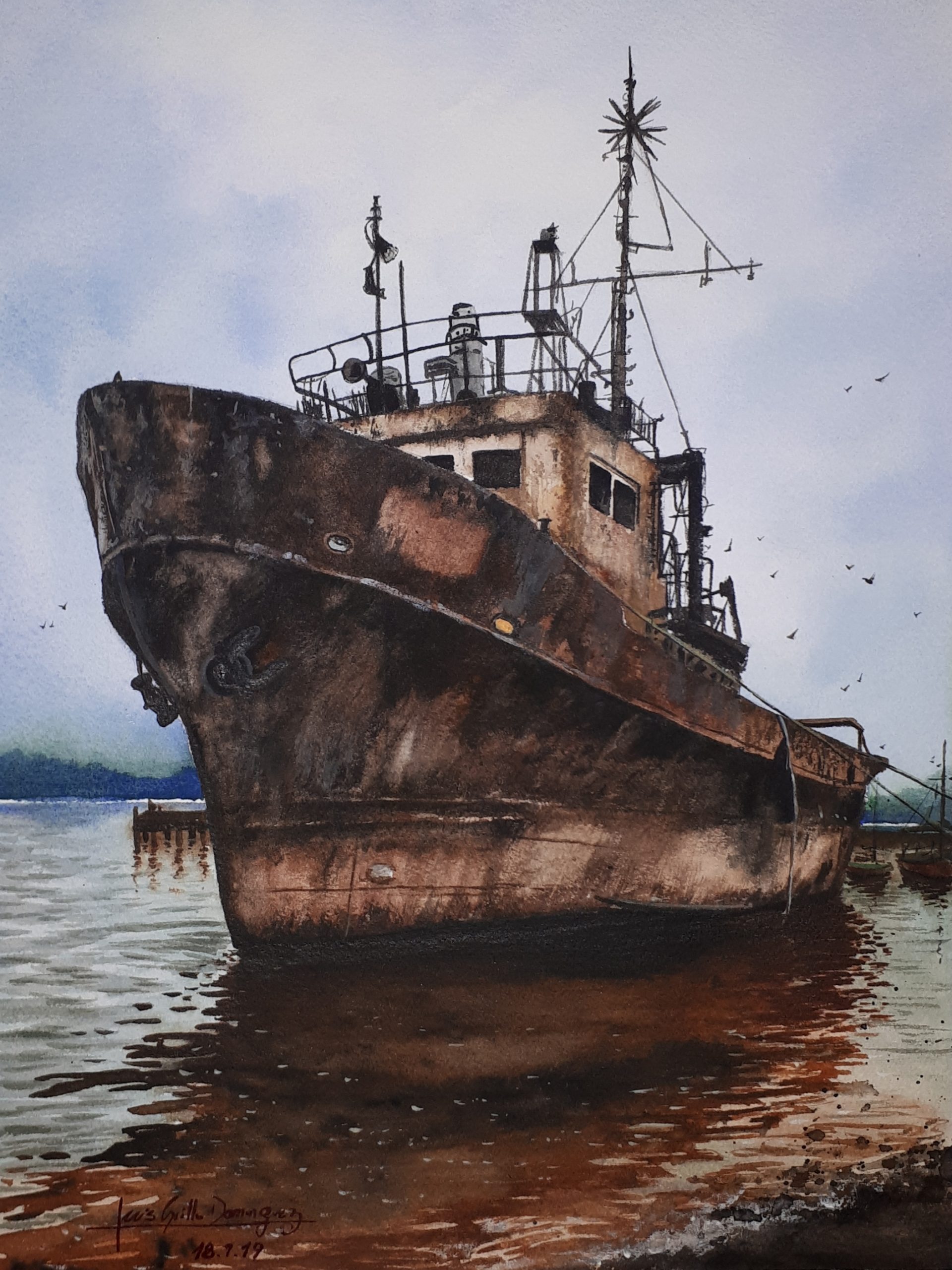 Las pinceladas detalladas resaltan la estructura del barco, con sus antenas, mástiles y la cabina, mientras que la luz suave que se refleja en el agua añade una sensación de calma y reflexión. Los tonos terrosos y marrones del barco se mezclan con los azules y grises del cielo, creando una atmósfera de nostalgia y belleza.
