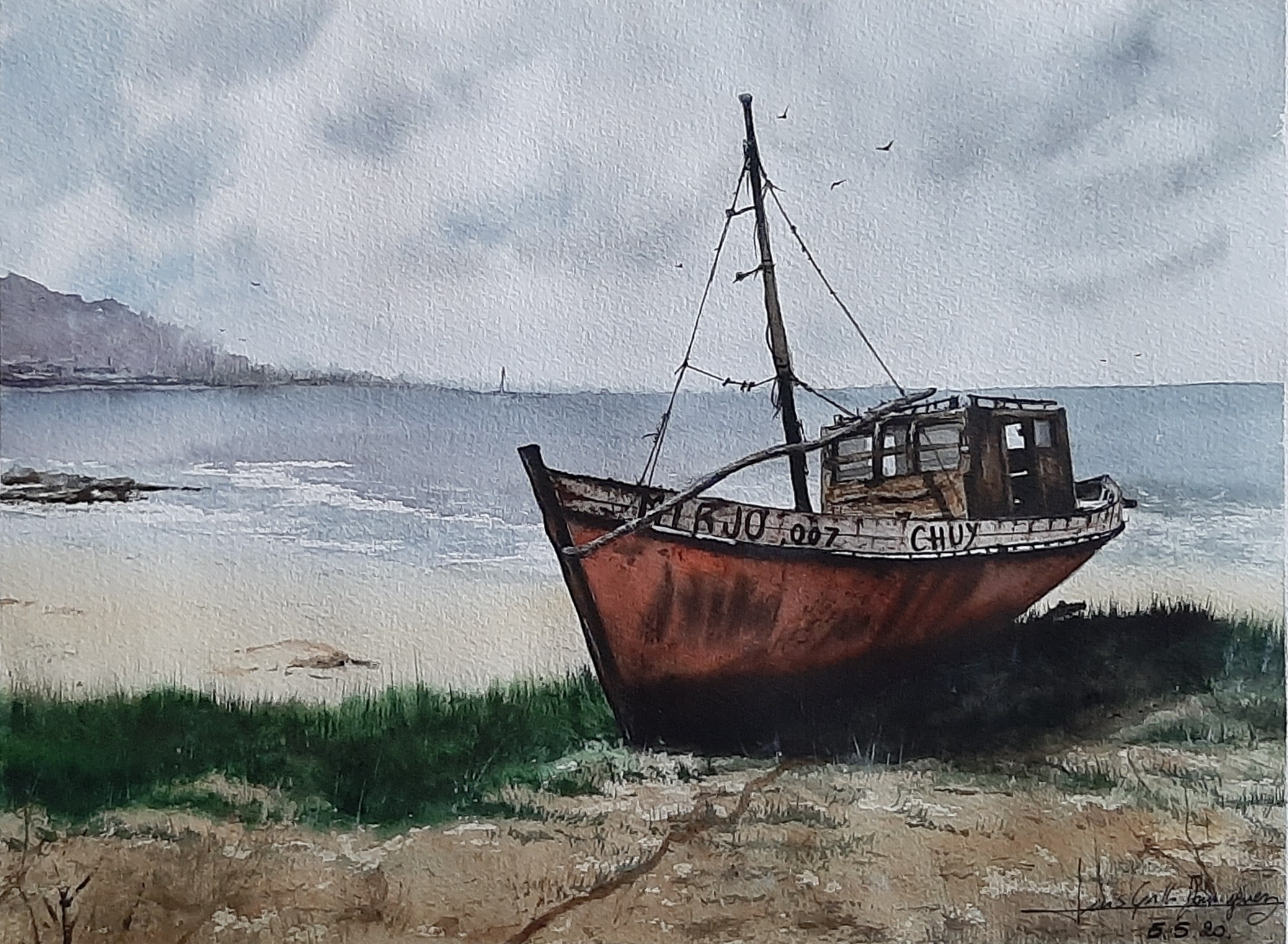 Acuarela Original: La Resiliencia de un Barco Varado