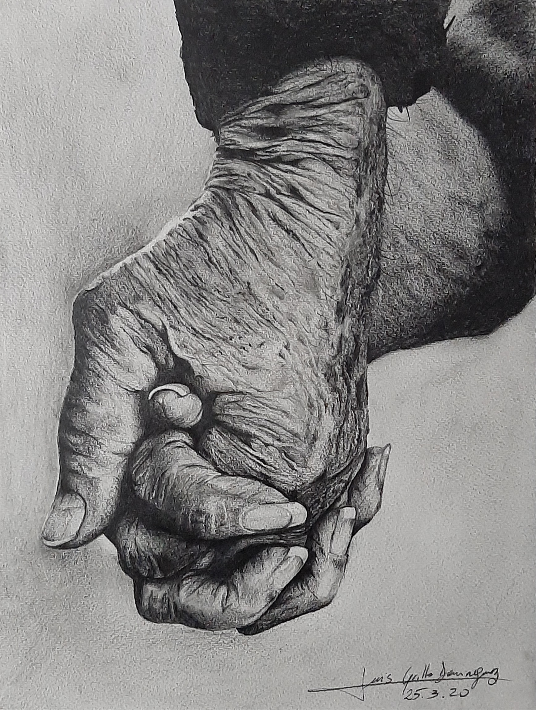 La meticulosa técnica de sombreado a lápiz resalta cada arruga y cada pliegue, dando vida a las texturas de la piel y comunicando una profunda narrativa de amor y cuidado. La obra es un poderoso recordatorio de que las manos, más allá de su apariencia, son portadoras de historias y emociones.