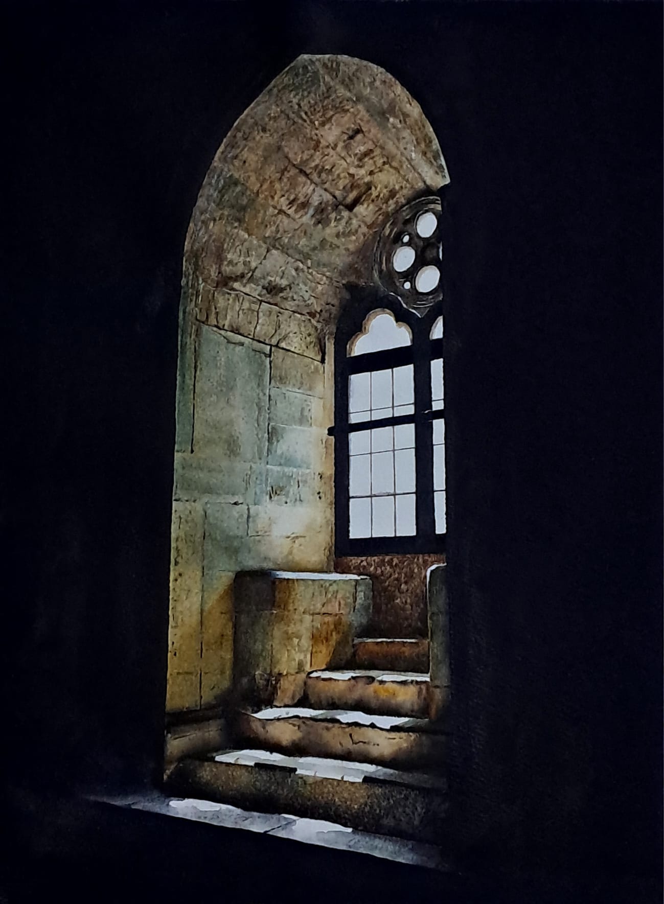 La técnica de acuarela me permitió recrear la textura porosa y pesada de los bloques de piedra, en contraste con la claridad casi etérea que entra desde el exterior. Con un manejo profundo de las sombras que rodean el arco y un cuidado detalle en los reflejos sobre los peldaños, esta obra busca transmitir una atmósfera de introspección y silencio, invitando a quien la observa a imaginar los pasos que alguna vez recorrieron este pasaje hacia la luz.